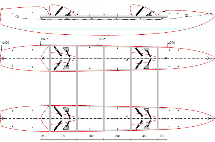 Гондолы катамарана – однослойные баллоны с внутренними страховочными баллонами (750л).