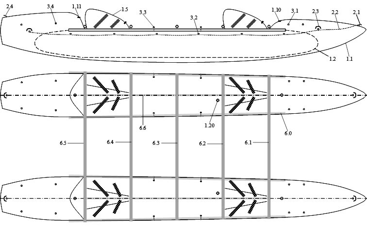 1. Гондола катамарана. 1.5. Сиденье надувное. 5.0. Самозакрывающийся клапан для заправки внутреннего баллона в силовую оболочку сидения. 5.1. Бедренные упоры с двойной металлической пряжкой. 5.10. Плоский ремень с петлей для крепления бедренных упоров к продольной трубе рамы. 5.11. Перемычка капроновая у основания бедренных упоров. 5.2. Коленные упоры. 5.20. Трапеция с двойной металлической пряжкой для крепления коленных упоров. 6.0. Продольная труба рамы. 6.3. Поперечная труба рамы с закреплёнными кницами. 6.30. Кница с стальным штырьком (закреплена на поперечной трубе). 6.11. Соединение боковой и поперечной труб капроновым силовым кольцом. 6.12. Дюралевый пруток – «скрутка». 6.13. Фиксатор «скрутки».