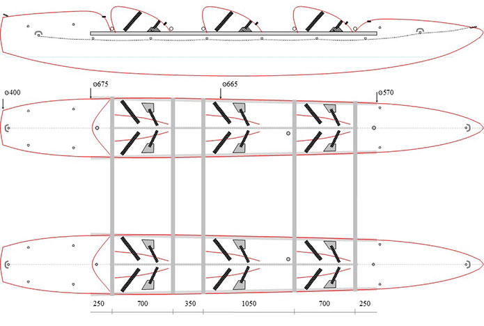 Гондолы катамарана – однослойные баллоны с внутренними страховочными баллонами (750л).