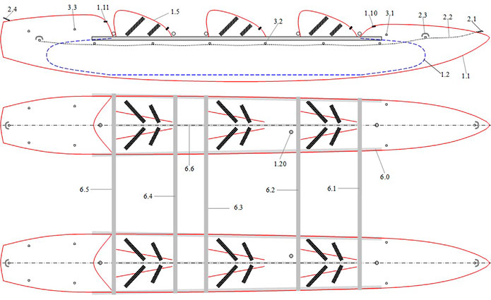 1. Гондола катамарана. 1.5. Сиденье надувное. 5.0. Самозакрывающийся клапан для заправки внутреннего баллона в силовую оболочку сидения. 5.1. Бедренные упоры с двойной металлической пряжкой. 5.10. Плоский ремень с петлей для крепления бедренных упоров к продольной трубе рамы. 5.11. Перемычка капроновая у основания бедренных упоров. 5.2. Коленные упоры. 5.20. Трапеция с двойной металлической пряжкой для крепления коленных упоров. 6.0. Продольная труба рамы. 6.3. Поперечная труба рамы с закреплёнными кницами. 6.30. Кница с стальным штырьком (закреплена на поперечной трубе). 6.11. Соединение боковой и поперечной труб капроновым силовым кольцом. 6.12. Дюралевый пруток – «скрутка». 6.13. Фиксатор «скрутки».